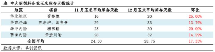 截至12月底,中大型飼料企業玉米庫存均有增加,且多數庫存在1個月以上。進入1月份,南方飼料企業備貨基本收尾,以訂單合同為主,高價現貨簽單意向不高。且生豬價格持續低迷,終端養殖利潤在盈虧線浮沉,春節前銷區玉米購銷偏淡,玉米價格實質性上行空間或偏窄。